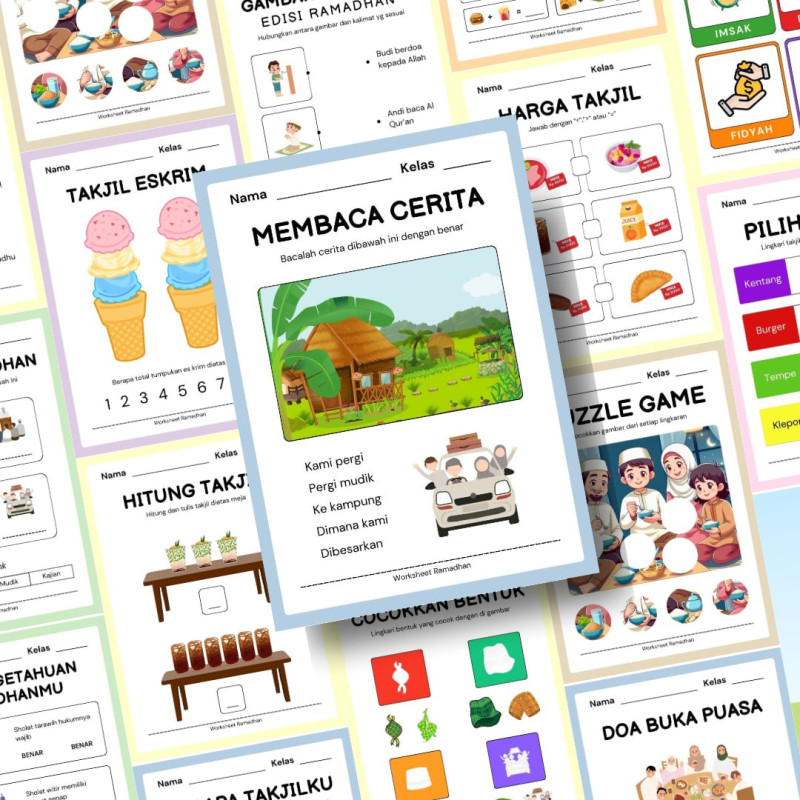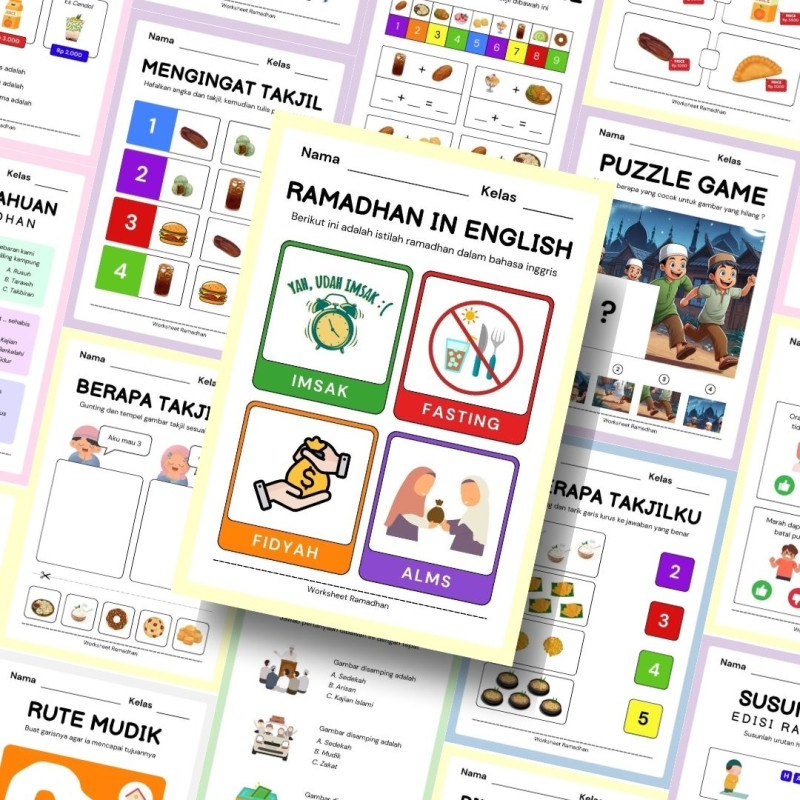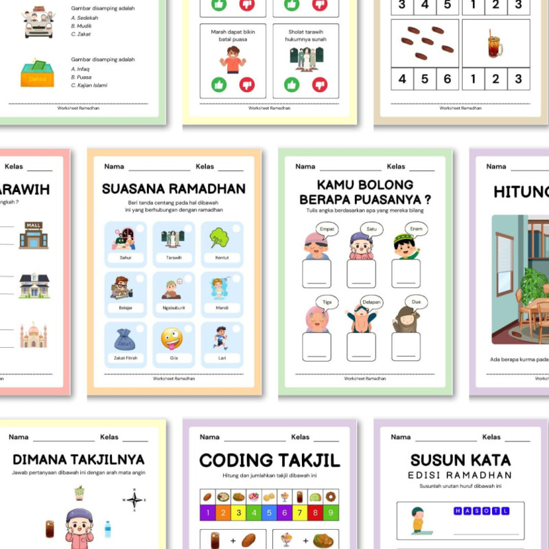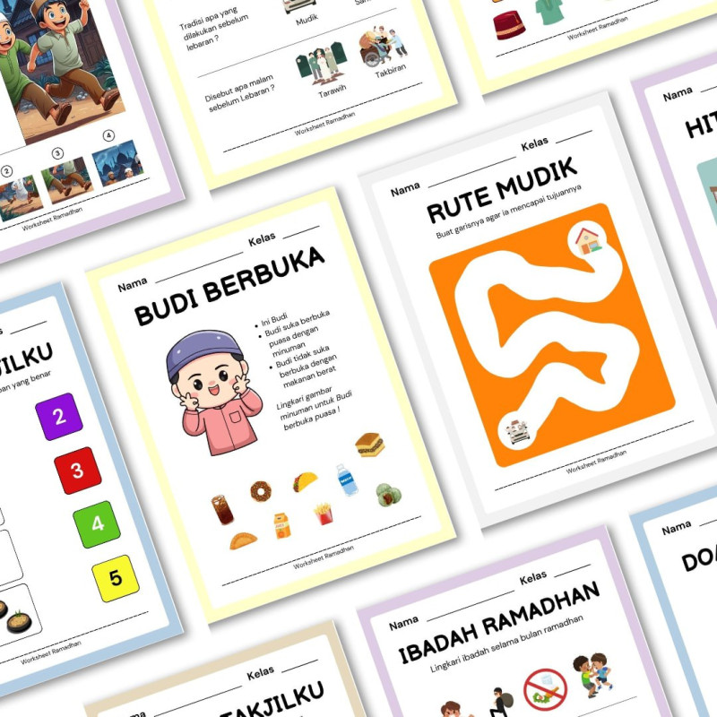 Tenang, worksheet ramadhan didesain full color untuk menarik minat belajar anak-anak.